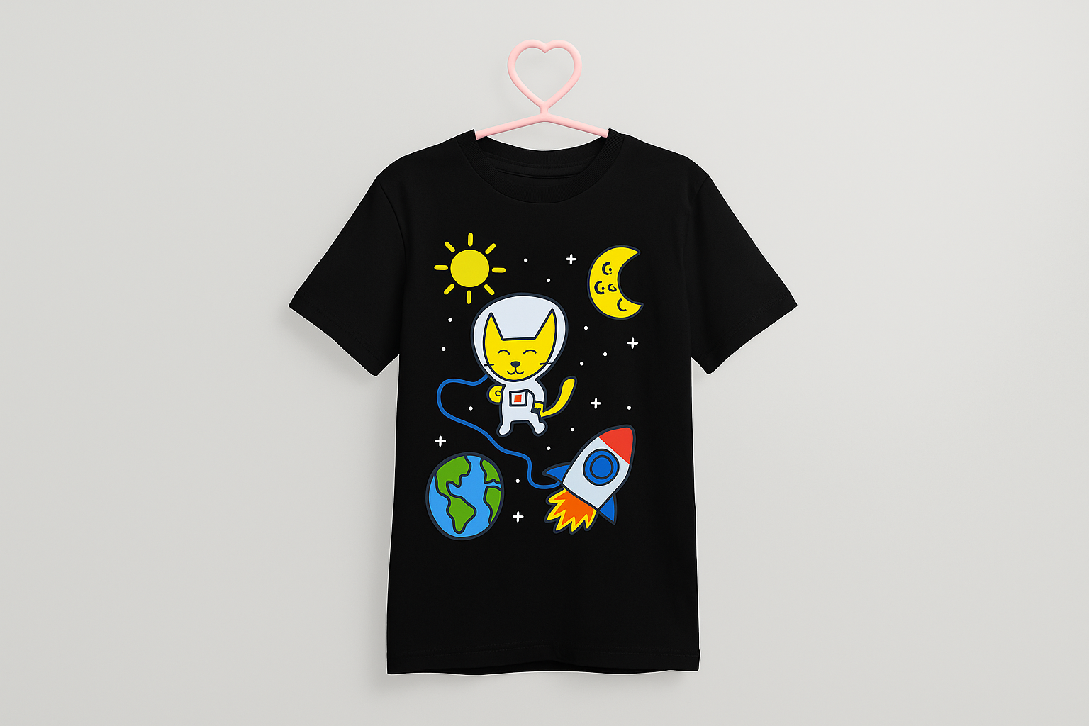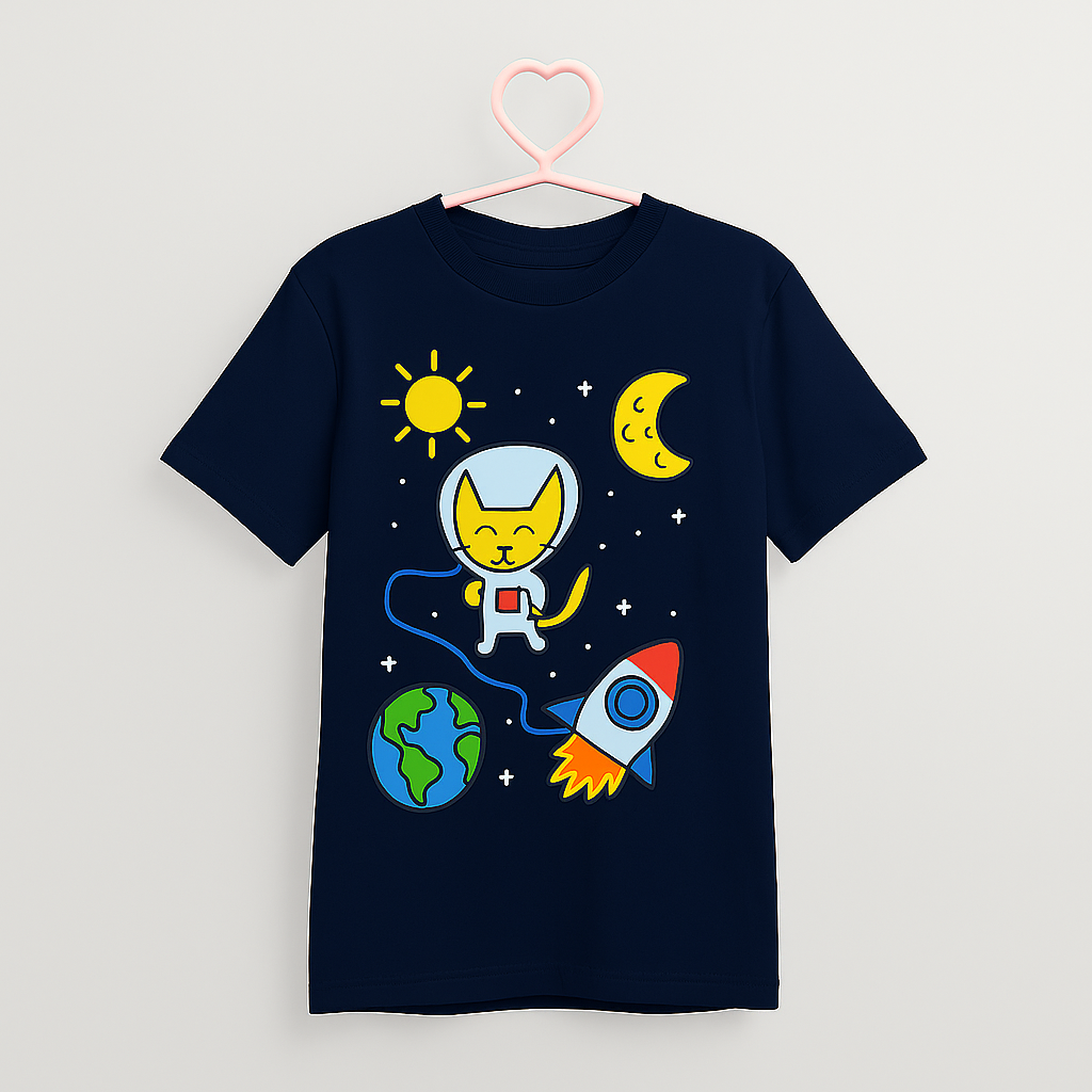 ¡Directo al espacio con estilo! 🌙✨ Esta divertida camiseta muestra al Gato Espacial de Nicole flotando entre planetas, cohetes y estrellas. Perfecta para niños y adultos que aman soñar en grande y mirar al cielo con curiosidad.